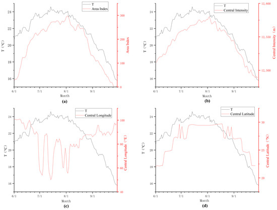 An analysis indicates strong correlations between the basin’s daily average temperature from 1954–2021 and both the coverage area and center strength of the South Asian High, deriving coefficients of 0.919 and 0.934, respectively, with both values significant at the 0.01 level. Figure 5 illustrates the comparative relationship between daily average temperatures and various characteristics of the South Asian High, including the area index, central intensity, central longitude, and central latitude. Depicted in Figure 5a, the area index—which measures the total grid points where geopotential height surpasses 12,500 gpm—exhibits notable growth between late July and early August, suggesting the SAH becomes both stronger and more expansive during this timeframe. The peak values for central intensity, a measure of the SAH’s central pressure strength as presented in Figure 5b, occur from late July through early August, corresponding accurately with the period when the SAH exerts its greatest influence on basin temperatures. Between July and early August, significant fluctuations characterize the central longitude (Figure 5c), indicating dynamic shifts in the SAH’s east–west positioning. The central latitude, presented in Figure 5d, exhibits remarkable stability, at approximately 30° N, in proximity to the basin from early July until mid-August, after which it begins a gradual southward migration. From late June through mid-August, these patterns indicate the SAH’s strong influence on basin temperature, while mid-August represents a critical transition between the main flood and post-flood periods as the SAH’s impact progressively weakens. Valuable insights regarding the relationship between the SAH and regional climate systems can be derived from this analysis, enhancing the understanding of temperature fluctuations in the basin.