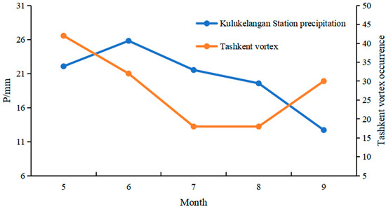 Comparison chart of frequency of Tashkent vortex occurrence and precipitation at Kulukelangan station.