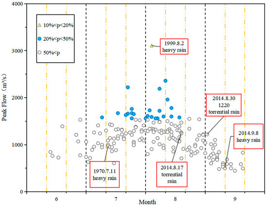 The temporal distribution of peak flows and occurrence frequencies for the 191 documented cases of snowmelt and snowmelt–rainstorm mixed floods is illustrated in Table 1 and Figure 7. According to statistical analysis, 70% of these flood events concentrated in the period from early July to mid-August. On 2 August 1999, the most significant flood peak was recorded, reaching a flow rate of 3110 m3/s. Flood peaks following mid-August exhibited unique seasonal patterns, with none exceeding a two-year recurrence interval. Based on these distribution patterns of snowmelt and snowmelt–rainstorm mixed floods, mid-August is chosen as the boundary between the main flood season and the post-flood period.