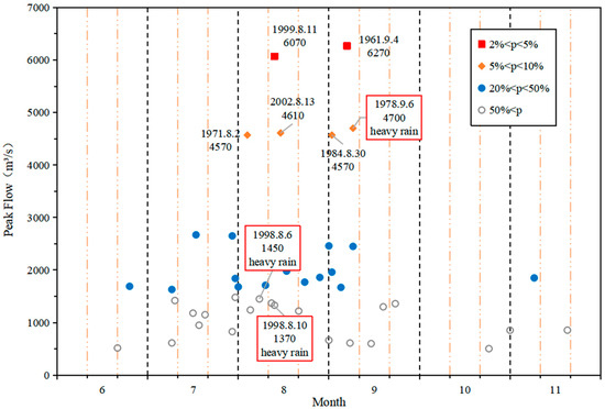 The temporal distribution of peak flows and their frequency of occurrence for 47 cases of glacier “dam-break” floods and glacier “dam-break”–snowmelt–rainstorm mixed floods are illustrated in Table 2 and Figure 8. Analysis indicates that 4 September 1961 marked the occurrence of the most significant flood event, which reached an extraordinary peak flow of 6270 m3/s. Flood events with a 20–50-year return period typically occurred between mid-August and early September. During early August, mid-August, late August, and early September, peak flows corresponding to a 10–20-year return period were primarily recorded. Early August was the main timeframe for floods with a 5–10-year return period. In comparison, floods with return periods shorter than 5 years displayed a broader temporal range, occurring anytime between June and November. Therefore, these observations suggest that glacier “dam-break” and glacier “dam-break”–snowmelt–rainstorm mixed floods exhibit a relatively dispersed temporal distribution without clear patterns of regularity.