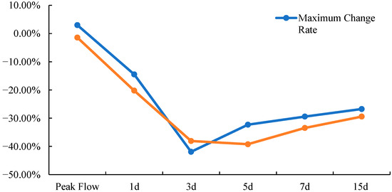 Table 3 and Figure 9 illustrate the variations in peak flow alongside average and maximum values for multiple runoff parameters—maximum daily, three-day, five-day, seven-day, and fifteen-day measurements—for glacier “dam-break” events and glacier “dam-break”–snowmelt–rainstorm mixed floods before and after August 20. Analysis of these data indicates a significant post-August 20 decrease in runoff. Specifically, maximum daily runoff demonstrated reductions of 20.9% in the average values and 14.2% in the maximum values. More significant declines appeared in the maximum three-day runoff, with the average values dropping by 38.9% and the maximum values by 41.8%. The average values of the maximum five-day, seven-day, and fifteen-day runoff decreased by more than 29%, and their maximum values also decreased by more than 26%. These consistent declines across various runoff quantities for both glacier “dam-break” events and the mixed snowmelt–rainstorm floods demonstrate significant seasonal characteristics in the post-August 20 period.