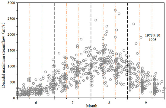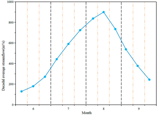 Analysis of Figure 10 and Figure 11 demonstrates that the maximum daily inflow reaches significantly higher values during July and August than in other periods, with peaks occurring in early August. Weekly average inflow displays a unimodal distribution pattern, cresting in mid-August before experiencing a sharp decline by the month’s conclusion. This difference in inflow before and after mid-August highlights the significant seasonal characteristics of the Altash Water Conservancy Project. Therefore, 20 August has been established as the boundary between the main flood season and the post-flood period, based on a thorough analysis of both maximum daily and weekly average inflow patterns.