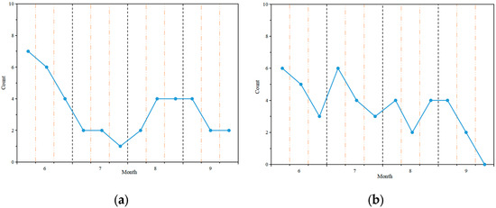 Southern Xinjiang experiences two effects from the Tashkent Low Vortex: significant precipitation events and periods of cold weather. Approximately 20% of rainfall events can be attributed to the Tashkent Low Vortex, with July exhibiting the most significant precipitation effects, while May and June follow in intensity [24]. Figure 6 presents a comparative analysis between basin rainfall data and the frequency of Tashkent Low Vortex occurrences. The data visualization in Figure 6 indicates that May experiences the highest frequency of Tashkent Low Vortex events, with June and September indicating the next highest occurrences. June marks the peak rainfall period, with May and July recording the second and third highest precipitation levels, respectively. A significant correlation between the Tashkent Low Vortex and rainfall patterns occurs during June and July, with June witnessing the majority of precipitation events. The region’s unique climatic profile is represented by infrequent precipitation events, making it unusual for rainfall alone to trigger significant flooding. Temperature considerations thus inform the designation of mid-August as the boundary separating the main flood season from the post-flood period.