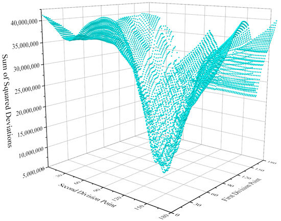 This segmentation process creates three portions: the first from 1~, the second from + 1~, and the third from + 1~n. The sums of squared deviations for these three segments—denoted as, , and —are calculated accordingly.