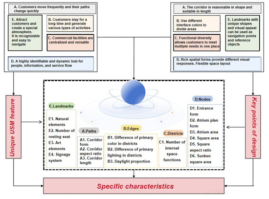 - The findings of this study support a stronger emphasis on human-centered design by suggesting improvements that (a) enhance the various connectivities of USMs; (b) refine the functional zoning and configuration according to diversified demand; (c) adopt a “fishbone” spatial layout with well-proportioned paths and clear nodes to relieve the discomfort caused by crowding in the dining area during peak hours; and (d) incorporate cultural and novel landmarks into USMs.