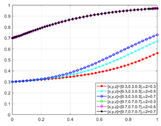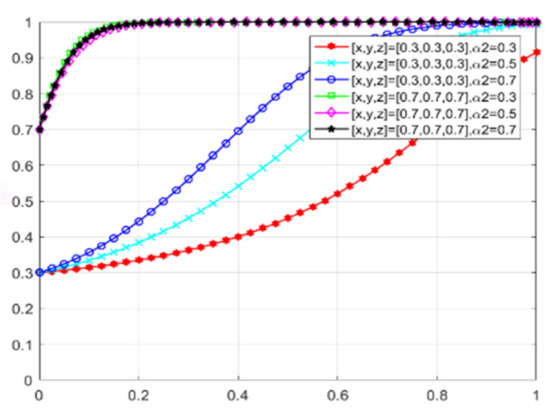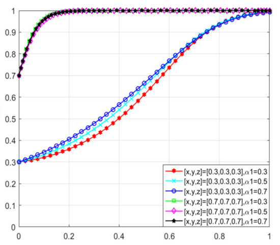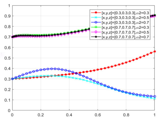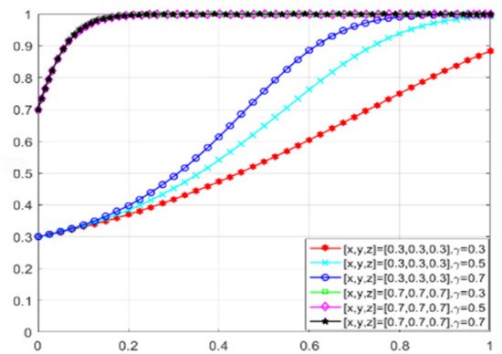 The changes in enterprises’ strategy choices over time are depicted in Figure 22. When the willingness of all three parties to adopt proactive strategies to promote green transformation is low, the green consumer market gradually expands as consumers’ green preference increases. Enterprises recognize market opportunities and begin to evolve toward green production, albeit at a relatively slow rate. Conversely, when all parties choose to cooperate and jointly promote the development of green ecological civilization, the rate at which enterprises evolve toward green production significantly accelerates. Additionally, as consumers’ green preference increases, the rate of evolution far exceeds that observed under low willingness levels.