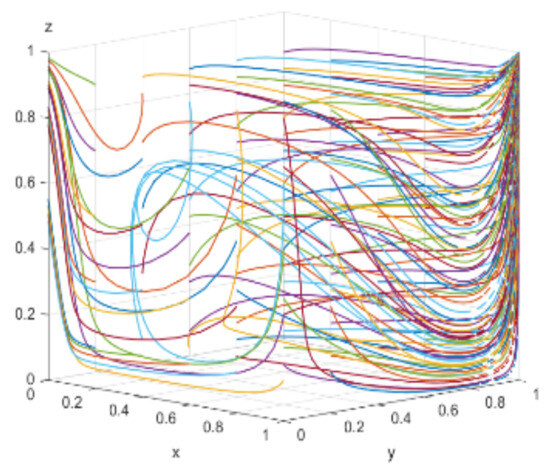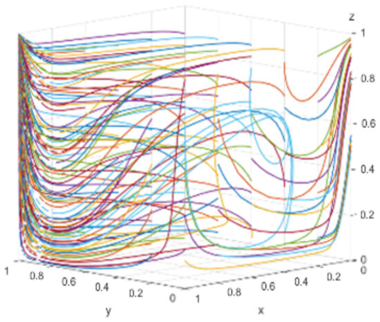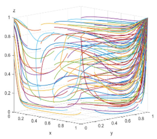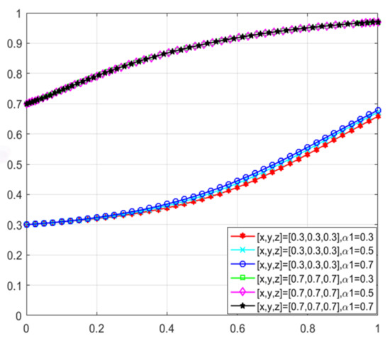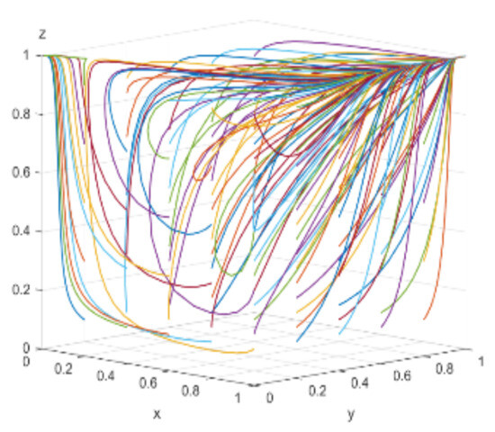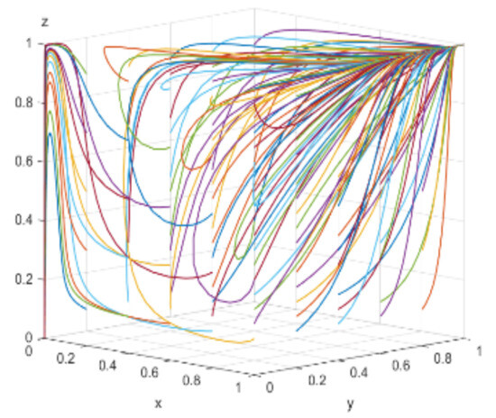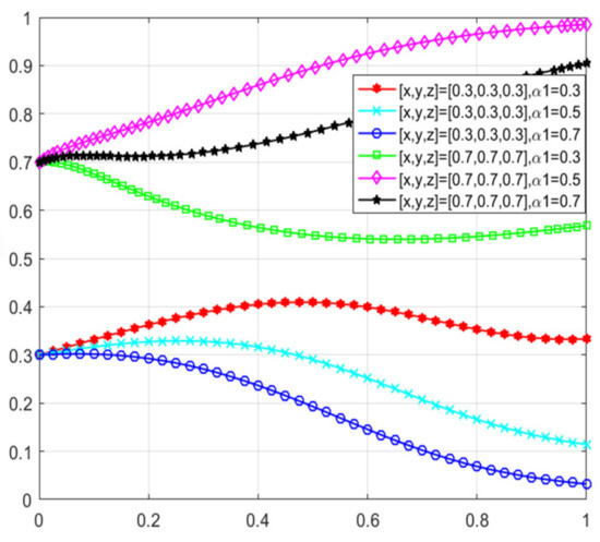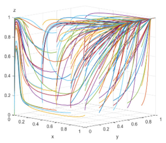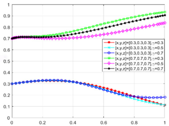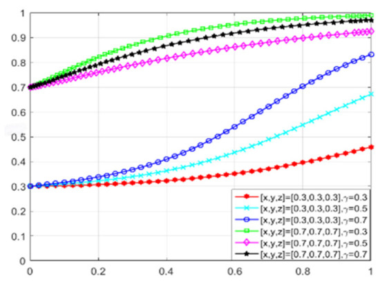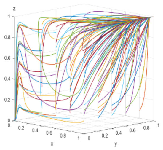 When consumers have varying degrees of green preference, the evolutionary trajectories of the three-party game are shown in Figure 18. As consumers’ green awareness awakens, the scale of the green consumer market expands, enterprises perceive profit opportunities and consider engaging in green technological innovations, and the government, aiming to open up the green consumer market, is willing to adopt proactive regulation. Figure 19, Figure 20 and Figure 21 respectively illustrate the evolutionary outcomes after 50 iterations for green preference levels of 0.3, 0.5, and 0.7.