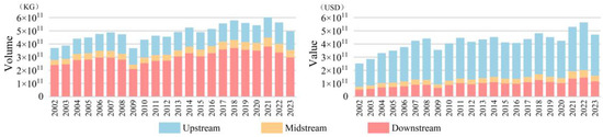 This study examines the overall changes in the trade volume and trade value of global upstream, midstream, and downstream wood forest products from 2002 to 2023, as illustrated in Figure 2.