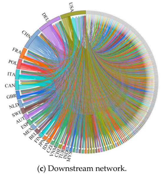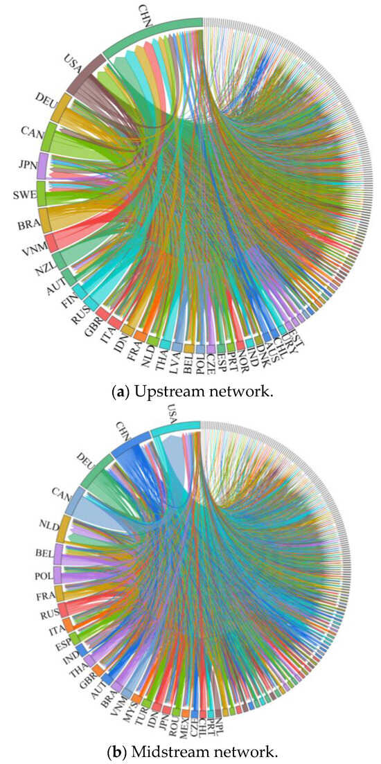 To clearly illustrate the trade volume relationships and proportional distributions among countries (regions) in the wood forest products trade network, this study employs chord diagram visualization to characterize trade patterns in three types of networks (Figure 3). In the diagram, the thickness of arcs represents trade volumes between countries (regions), with arrows indicating trade directions. Distinct trade dynamics emerge across different types of trade networks among countries (regions), reflecting variations in market vitality, trade relationships, and network balance. Regarding trade scale, the polarization degree of upstream networks significantly surpasses that of midstream and downstream networks.