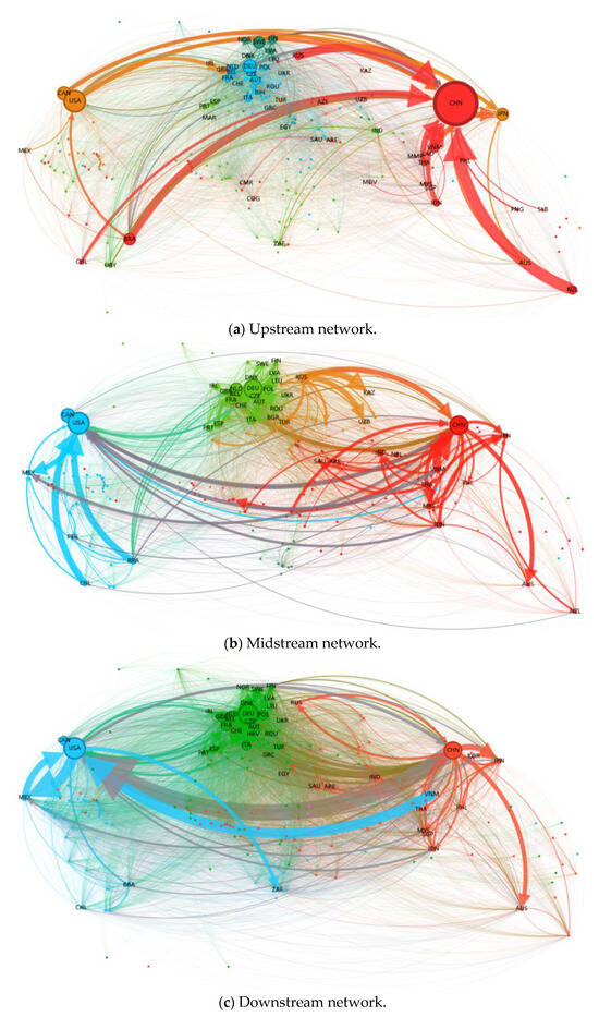 After determining the topological structure of the wood forest products trade network, we applied the Louvain community detection algorithm to divide trade communities in the upstream, midstream, and downstream networks. This approach further reveals clustering relationships among countries (regions) and the characteristics of community structures within the network, with the results illustrated in Figure 4.