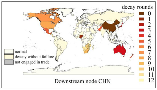Network disruption resilience refers to a network’s ability to maintain or restore acceptable performance under natural risks or intentional attacks [42]. Dynamic resilience assessment through cascading failure analysis under load redistribution mechanisms constitutes a critical research focus [43]. Cascading effects are defined as dynamic mechanisms where initial failures propagate through physical, social, or economic subsystems, ultimately causing severe consequences [44]. The existing studies predominantly employ load–capacity models. Crucitti et al. (2004) developed a cascading failure model with dynamic traffic redistribution, revealing the impacts of single-node failures on network efficiency [45]. Ash and Newth (2007) optimized complex networks against cascading failures using evolutionary algorithms [29]. Wang et al. (2008) established an initial node load-based model to quantify attack vulnerability in scale-free networks [46], while proposing locally weighted redistribution rules to analyze robustness in weighted networks [47]. Dueñas-Osorio and Vemuru (2009) introduced a tolerance parameter model to quantify capacity–demand relationships in infrastructure networks [48]. Recent advances focus on weighted networks and domain-specific systems. Mirzasoleiman et al. (2011) compared network performance under three weighting strategies: edge betweenness, node degree, and betweenness-degree products [49]. Mukherjee et al. (2014) investigated adaptive mechanisms for catastrophic disruptions in telecommunication networks [50]. Han (2017) proposed a tunable cascading failure model, integrating node betweenness, degree, and weight for initial load construction [51]. Li (2018) developed network connectivity entropy metrics for hierarchical network reliability assessments [52]. Cui (2021) designed network operation degree indicators to evaluate failure impacts in directed weighted supply chains [53]. Cascading failure research in trade networks has recently emerged: Li et al. (2021) simulated avalanche effects in global plastic waste trade networks [54]. Hao et al. (2023) assessed lithium trade network robustness under random/targeted attacks [55]; Fu et al. (2024) proposed two-stage recovery strategies for automotive supply chains, identifying underload nodes as primary resilience degradation drivers [56]. Yin et al. (2024) revealed crisis propagation patterns in semiconductor trade networks [57]. Wang et al. (2024) incorporated national risk absorption capacities into improved models for iron ore trade disruption analysis [58]. Finally, Ouyang et al. (2024) combined trade volume and network analysis to characterize static/dynamic resilience in lithium supply chains [59].