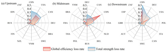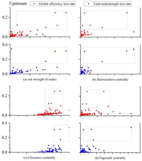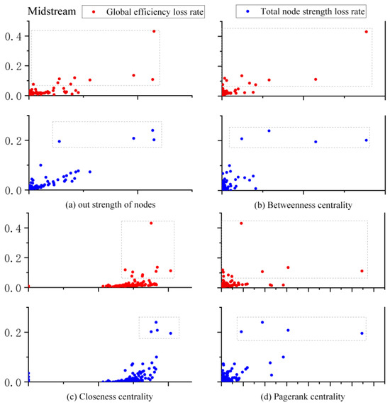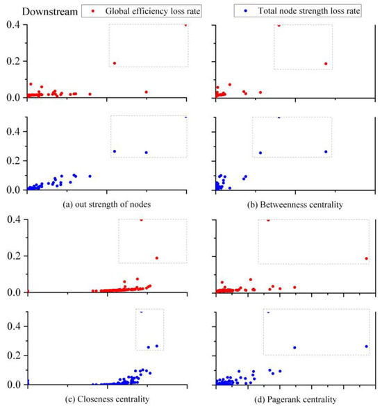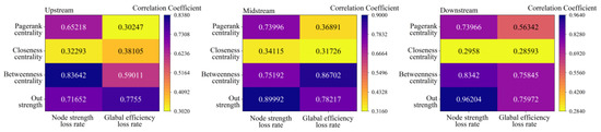 The interpretation criteria for Pearson’s correlation coefficient (r) are as follows: |r| > 0.8 indicates an extremely strong correlation, 0.6 ≤ |r| < 0.8 represents a strong correlation, 0.4 ≤ |r| < 0.6 suggests a moderate correlation, 0.2 ≤ |r| < 0.4 denotes a weak correlation, and |r| < 0.2 signifies a very weak or negligible correlation. According to Figure 12, we can derive the following information: (1) node out-strength demonstrates strong correlations with all types of network performance loss rates, indicating that the out-strength of nodes significantly impacts the overall performance and stability of networks. Nodes with high out-strength may play crucial roles in information dissemination or resource allocation within networks. (2) Node betweenness centrality shows a strong correlation with the node total strength loss rate, suggesting that bridge nodes exert an important influence on node-level performance loss. In midstream and downstream networks, betweenness centrality also maintains strong correlations with the global efficiency loss rate, while its correlation weakens in upstream networks. This implies that upstream network structures and functions might be more complex, with node influence distributed more diffusely. (3) PageRank centrality exhibits strong correlations with the node total strength loss rate but only a moderate correlation with the global efficiency loss rate, indicating that nodes with high PageRank centrality primarily exert influence at local rather than global scales. (4) Although nodes with high closeness centrality possess shorter path lengths in networks, the correlations between node closeness centrality and both the node total strength loss rate and global efficiency loss rate remain moderate. This suggests that a node’s positional advantage in networks has relatively weak impacts on network performance and may not be a critical determinant of network performance degradation.