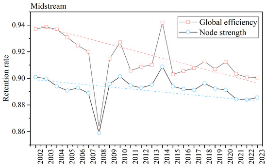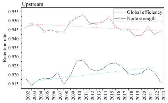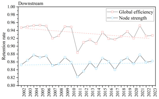 Figure 15 demonstrates that, from 2002 to 2023, the disruption resilience based on global efficiency declined in the downstream network, while resilience based on node total strength displayed a marginal increase—a trend similar to the upstream network but with gentler slopes. This suggests that the downstream trade network, which is characterized by higher globalization, market maturity, and competitive intensity, exhibited more stable resilience evolution compared to the upstream network.