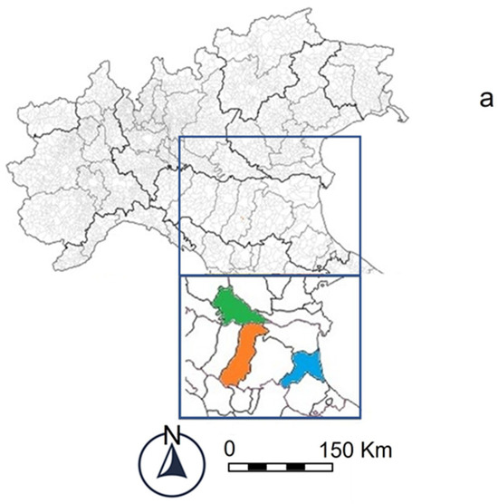 (a) Location of the provinces of Modena (orange), Mantova (green), and Ravenna (blue) in Northern Italy. (b) Monitoring station siting in the province of Mantova (top left), Modena (top right), and Ravenna (bottom). ID numbers indicate the different stations, according to the information in the caption of Table 1.