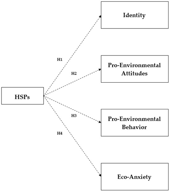The aim of the present study is to examine the relationship between the HSP trait and environmental identity, focusing on how this trait influences pro-environmental attitudes, behaviors, and susceptibility to eco-anxiety (Figure 1). Specifically, this research seeks to understand whether heightened sensitivity is associated with a stronger identification with nature, greater engagement in environmentally responsible actions, and increased vulnerability to distress related to environmental concerns.
