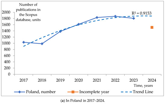 For Poland, the trend line is directed from bottom in 2017 to top in 2023 (Figure 1a). However, starting from 2021, the growth rate of the number of publications slowed down, and from 2022, the number of publications began to decline. The year 2024 is an incomplete year on the date of analysis, so these data were not taken into account in the correlation analysis. The correlation coefficient R2 = 0.9153 (Figure 1a) indicates a fairly high degree of polynomial dependence between the variables under consideration. A high value of R2 means that about 91.53% of the variation in the number of publications is explained by changes in time within the framework of this model. This indicates that the model describes the observed data well and the identified relationship is significant. However, despite the high level of correlation, there remains about 8.47% of the variation that the model cannot explain. This may be due to the influence of factors not included in the analysis, as well as to the presence of random errors. So, Figure 1a does not allow us to accept the first research hypothesis.