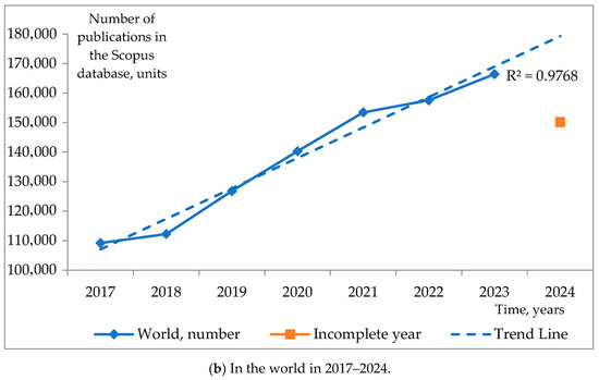Figure 1b demonstrates a growth in the number of publications for the keyword “education” for the world in 2017–2023. The year 2024 is an incomplete year on the date of analysis, so these data were not taken into account in the correlation analysis. The correlation coefficient R2, close to one (Figure 1b), indicates a strong degree of linear dependence between the analysed variables. This indicates that the variation of the number of publications is almost completely explained by the change in time. Checking other forms of graphical dependence (exponential, logarithmic, and polynomial) did not lead to an increase in the correlation coefficient R2.