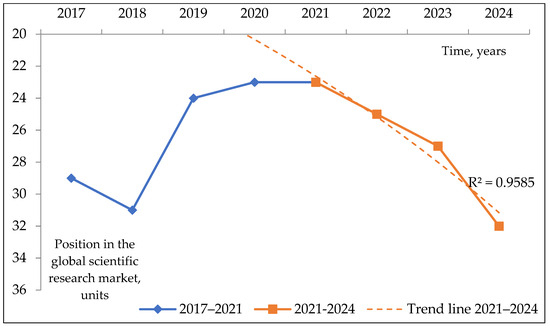 As noted above, a violation of the stability of the growth in the number of publications was recorded in 2021 [4,28]. Therefore, from 2021 to 2024, a correlation analysis was performed and a trend line was built (Figure 2). Visually, Figure 2 shows a sharply downward trend line with R2 = 0.9602. A high value of the correlation coefficient indicates a very high degree of exponential dependence between variables. An R2 value of 0.9602 means that about 96.02% of the variation in the position in the global scientific research market is explained by changes in time within the framework of this model. This indicates a significant and strong relationship between variables.