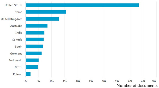 Figure 3 shows the clear leadership of scientists from the United States in the number of publications in the Scopus database. China and the United Kingdom have second and third positions with a significant gap. Then, there was a gradual decline in the position in the global scientific research market. Poland is in 27th position in the global scientific research market in 2023 (Figure 2 and Figure 3). This result allows us to confidently reject the third research hypothesis.
