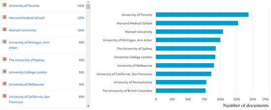 Figure 4 shows the clear leadership of the University of Toronto (1435 documents) and Harvard Medical School (1274 documents). Despite the fact that Canada is in sixth place in the ranking (Figure 3), the University of Toronto is the undisputed leader among universities (Figure 4). Polish universities are not in the list of the top 10 world universities that are leaders in the number of publications on the topic of education in the Scopus database for 2023.