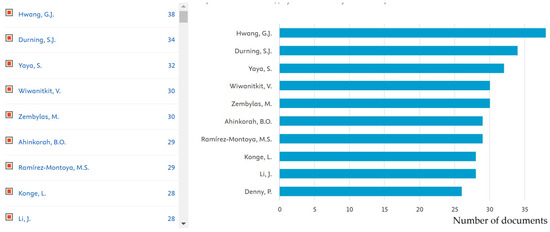 In the next step, the author assessed the top 10 countries, top 10 universities, top 10 authors, and top 10 branches of knowledge by the number of publications in the Scopus database. The top 10 countries, universities, authors, and branches were selected for analysis on the methodological basis of the Scopus database. Ten also is a number that allows drawing the most general picture. Moreover, being in the top 10 list declares a strong leading position. For example, the authors of the paper [23] processed articles only in the top 10 journals indexed in the Scopus database. Thus, the authors of the paper [23] did not waste readers’ time studying the results published in mid- and low-level journals. The authors showed where scientific leaders are leading science [23]. This review also shows who the leaders are in education research and where they are leading educational science.