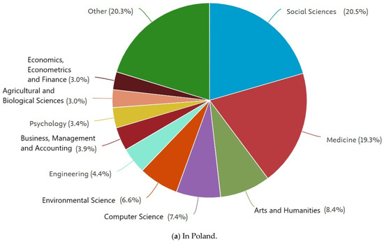 Figure 6a shows a share of documents in education sciences on branches of knowledge in Poland. These are the top 10 branches of sciences related to education. The maximum number of publications is in such branches as Social Sciences (20.5%) and Medicine (19.3%). The difference with the world result appears in the third position (Figure 6b). Here are the Arts and Humanities (8.4%). Computer Science makes up 7.4% and occupies the fourth position. Another difference is publications with undefined branches. They occupy a slightly larger share (20.3%). The unspecified branches include 17 branches. Among the Polish publications, there are no branches related to SDG 4 or other SDGs.