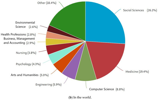 Figure 6b shows the share of documents in education sciences on branches of knowledge in the world. These are the top 10 branches of sciences related to education. The maximum number of publications on the topic of education are in such branches as Social Sciences (26.1%) and Medicine (19.4%). In third place is Computer Science (8.8%). A large number of publications are in unspecified branches (18.4%). There are 17 unspecified branches. There are also no branches related to SDG 4 or other SDGs.
