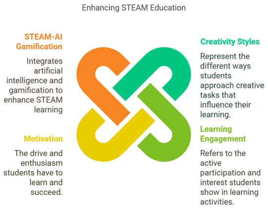 However, the research on the effect of creativity styles ACT (actively engage) and FLOW on engagement and motivation in STEAM education remains limited. Thus, this study aimed to close the research gap by examining the influence of creativity styles on learning engagement and motivation in STEAM education, with a focus on the critical inner processes of learning. The creativity style of ACT assesses the cognitive activity necessary for creativity and generating creative solutions. Using ACT, people actively engage in generating ideas, often breaking down problems into smaller pieces, and systematically explore solutions. The creativity style of FLOW is a remarkable state in which creativity seems to occur naturally. It implies a mental state of intense concentration that is free from fear, boredom, and self-doubt and requires an open-minded environment with support and encouragement [19]. We extended the concept of engagement to include cognitive, behavioral, emotional, and social engagement, aiming to investigate the differences in learning engagement between the ACT and FLOW creativity styles before and after the implementation of the STEAM materials. This study offers a learning model for creativity styles, with learning engagement and motivation in the artificial intelligence (AI)-driven STEAM education system. This connection between AI and STEAM can be utilized to echo the abovementioned education theories. The STEAM–AI gamification could be designed in education to trigger students’ learning engagement and motivation for creativity. The following sections present the literature review, methodology, results, and discussion, and address the research questions in the conclusion for the empirical study.