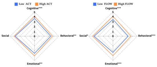 Table 1 shows significant differences between low and high ACT for all dimensions except for the social dimension, indicating that the high ACT group experienced higher learning engagement than the low ACT group. Table 2 shows significant differences between low and high FLOW, which means that the high FLOW group had higher learning engagement than the low FLOW group.