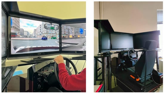 To evaluate how eco-driving influences emissions and road safety, this study employed a driving simulator based at the National Technical University of Athens in the Department of Transportation Planning and Engineering. The simulator utilized was a FOERST FP Driving Simulator (Figure 1), consisting of a motion-enabled base, a driver seat, and three wide Full HD screens that provided a 170-degree field of view. The device, measuring 230 × 180 cm with a base width of 78 cm, allowed for realistic virtual driving environments.