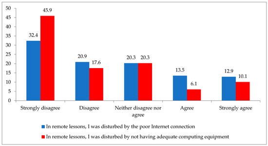 - A set of attitudes toward the availability of the means for accessing remote lessons. On a five-point Likert scale from “1 = Strongly disagree” to “5 = Strongly agree”), the respondents assessed the following statements: “In remote lessons, I was disturbed by the poor Internet connection” and “In remote lessons, I was disturbed by not having adequate computing equipment”.