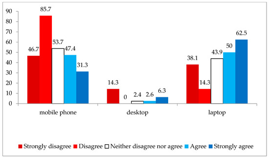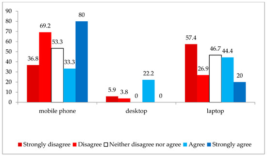The students who attended remote lessons via their mobile phones disagreed to a much larger extent that ERT contributed to the improvement of their digital competences, unlike the students who attended remote lessons via their laptops (Figure 7).