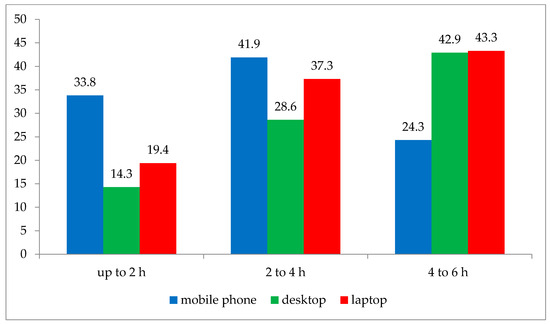 The students who spent the largest number of hours attending ERT on a daily basis mostly used laptops and desktop computers, while the smallest number of hours of ERT attendance was spent by the students who attended remote lessons on their mobile phones (Figure 3).