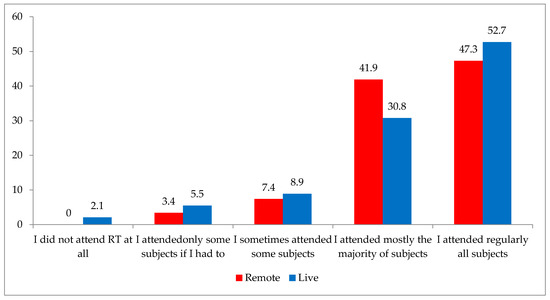 Regarding the attendance of ERT, the regularity was higher in remote lessons (Figure 4).