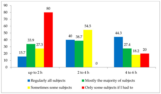 The students who spent the longst number of hours per day attending ERT also on the largest scale attended ERT from all subjects; from two to four hours on a daily basis these lessons were attended on average mostly by the students who sometimes attended certain subjects, while the smallest number of hours per day were spent on ERT by the students who attended only the lessons in certain subjects in case they had to (Figure 5).