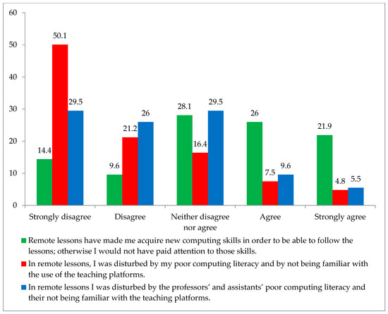 - A set of attitudes toward computing competencies referred to the assessment of one’s and professors’ competencies in relation to information technologies. On a five-point Likert scale from “1 = Strongly disagree” to “5 = Strongly agree”), the respondents assessed the following statements: “Remote lessons have made me acquire new computing skills in order to be able to follow the lessons; otherwise I would not have paid attention to those skills”, “In remote lessons, I was disturbed by my poor computing literacy and by not being familiar with the use of the teaching platforms”, and “In remote lessons I was disturbed by the professors’ and assistants’ poor computing literacy and their not being familiar with the teaching platforms”.