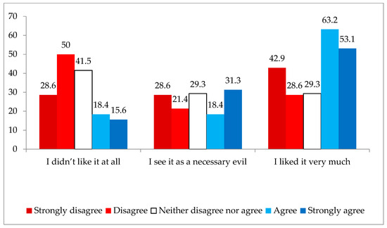 - The attitude toward the interestingness of RT was investigated with the aid of the statement: “Remote teaching was interesting because online lessons brought dynamics and novelties into the teaching process”, which was measured using a five-point Likert scale (from “1 = Strongly disagree” to “5 = Strongly agree”).
