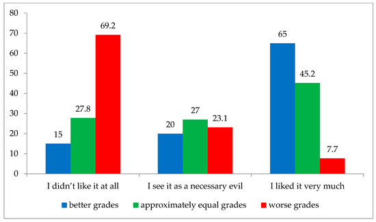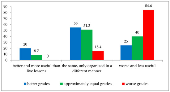 The students who got better grades in the examinations taken after ERT than in those taken after the subjects attended through traditional forms of teaching, as well as those who got approximately equal grades, mostly believed that RT was the same teaching only organized in a different manner (Figure 11). Conversely, students who got worse grades in the examinations taken after ERT mostly believed that RT was worse and less useful than the traditional form of teaching.