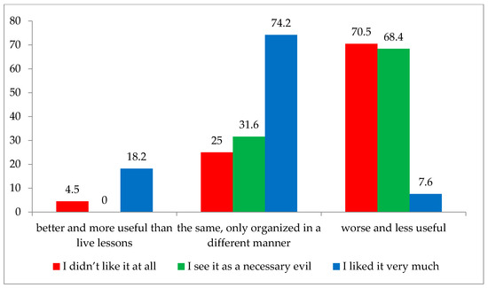 Students who received worse grades in the examinations taken after ERT than in those taken after traditional forms of teaching do not like RT at all, while those who received better or approximately equal grades in the examinations taken after ERT liked RT very much (Figure 12).
