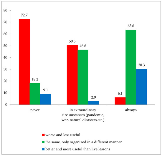 Students who complained about teachers’ poor digital literacy and lack of knowledge about the use of teaching platforms in ERT mostly believed that RT was worse and less useful than the traditional model of teaching (Figure 8). Students who believed that the obstacle to their adoption of knowledge was not the teachers’ poorer computing literacy in ERT mostly believed that RT was the same teaching, only organized in a different manner.