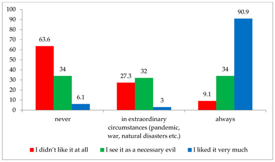 To 7.5% of students, re-introduction of RT would not be acceptable at all; to 70.1% of them, it would be acceptable only in extraordinary circumstances (pandemic, war, natural disasters, etc., or as ERT), while 22.4% of students would accept RT as a permanent practice.
