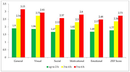 - The length of remote lessons on a daily basis: the students were asked how many hours a day they spent on average attending remote lessons, and their answers were subsequently classified into the following categories (up to 2 h, 3–4 h, and 4–6 h).