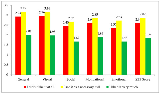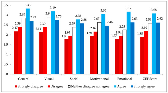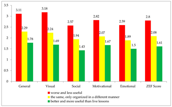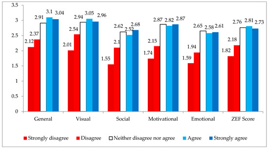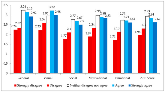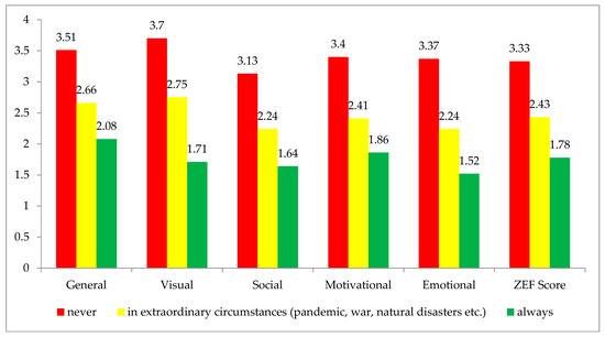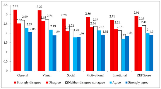 - Zoom Exhaustion and Fatigue Scale [12]—ZEF Scale is an instrument intended for assessing the respondents’ fatigue intensity and the modality of their fatigue after attending remote lessons. The scale consists of 15 items, with 3 items for each of the five fatigue modalities: general, visual, social, emotional, and motivational (e.g., “I felt tired after attending the remote lesson”). Moreover, the overall result on the scale is also taken into account. The respondents gave answers on a five-point Likert scale (from “1 = Strongly disagree” to “5 = Strongly agree”). The scale reliability measured by Cronbach’s alpha in the original research was between 0.82 and 0.90 [12] and between 0.70 and 0.91 [47].