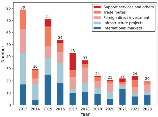 Figure 1 shows the time distribution of enterprises participating in the BRI that started responding to the BRI by years and mechanisms, compiled by the authors based on public information, including the following: exploration of international markets (127 enterprises), involvement in international infrastructure projects (100 enterprises), outward foreign direct investment (92 enterprises), involvement in or benefit from the development of trade routes (71 enterprises), and provision of support services or others (35 enterprises).