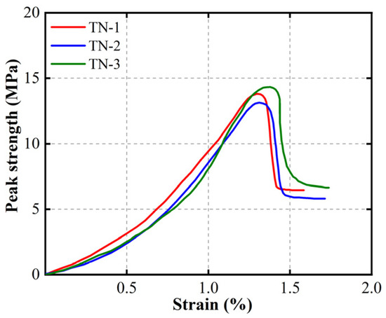 The mudstone samples for the experiment were obtained from the roof of the 21-1 coal seam at the Ili No. 4 Mine of Xinwen Mining Group by on-site core drilling. The samples were prepared into standard specimens and subjected to different moisture contents using a constant temperature and humidity chamber and a drying oven. According to exploration reports from the study area, the roof rock mass of the 21-1 coal seam demonstrates good homogeneity and relatively stable mechanical properties. Before beginning the main experiments, three naturally moist mudstone samples were subjected to uniaxial compression tests under identical conditions. These preliminary tests confirmed the mudstone’s homogeneity and ensured the reliability of subsequent results. The measured strengths were 13.14 MPa, 13.82 MPa, and 14.34 MPa, respectively. The stress–strain curves of these specimens also showed good consistency, as presented in Figure 1. Therefore, the mudstone samples used in this experiment were considered to possess stable mechanical properties, fully satisfying the requirements for accuracy and reliability in the testing process.