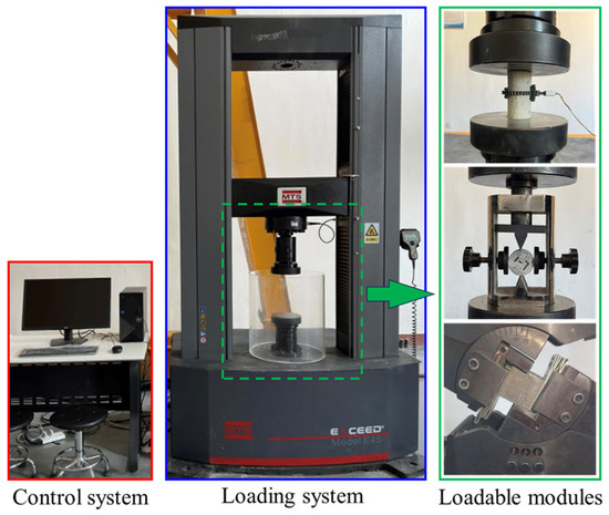 The testing equipment used was the MTS-E45.605 electronic universal testing machine, as illustrated in Figure 2. The molds can be replaced during the experiment to meet various testing requirements. Uniaxial compression, Brazilian splitting, and shear tests were conducted on mudstone samples with varying moisture contents. Field measurements and prior research [21] show that the overburden rock of the 21-1 coal seam typically fractures at an angle of about 60°, so the shear angle was set accordingly to 60° during shear testing.