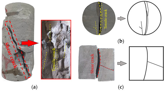 Failure characteristics of weakly cemented mudstone after water infiltration. (a) Uniaxial compression tests; (b) Brazilian splitting tests; (c) 60° shear tests.