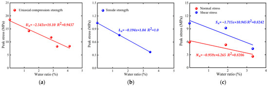 The experimental results were linearly fitted to derive the strength reduction curve function for weakly cemented mudstone, as expressed in Equations (1)–(4). Figure 4 illustrates the relationship between uniaxial compressive strength , tensile strength , normal stress , shear stress , and moisture content in weakly cemented mudstone. As moisture content increases, the rock softens and expands, which accelerates the development of microcracks and pores, undermining the rock’s structural integrity and leading to strength degradation.