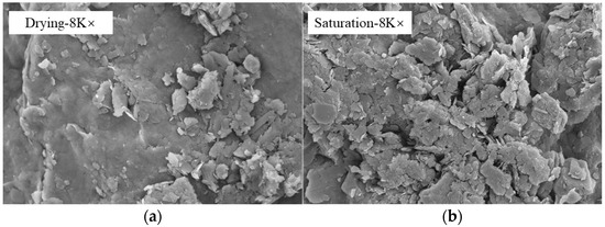 The microscopic structures of mudstone samples under different moisture conditions are presented in Figure 6. In their natural state, the mudstone surfaces are rough, with tightly packed particles, some of which are raised in blocky formations. The rock exhibits foliated cementation with few cracks and pores, as shown in Figure 6a. After immersion, the mudstone displays a marked increase in porosity, a weakening of cementation, and an accumulation of cementing material. Plate-like clay minerals accumulate on the particle surfaces, as seen in Figure 6b.