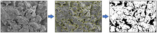 Pores were identified through image recognition software, and binary processing was applied to calculate the porosity before and after water immersion, as shown in Figure 7. In the natural state, the mudstone porosity was 9.74%, which increased to 25.22% after saturation, marking a 1.5-fold increase. The dissolution of certain hydrophilic minerals within the mudstone significantly enhanced internal porosity and microcrack development.